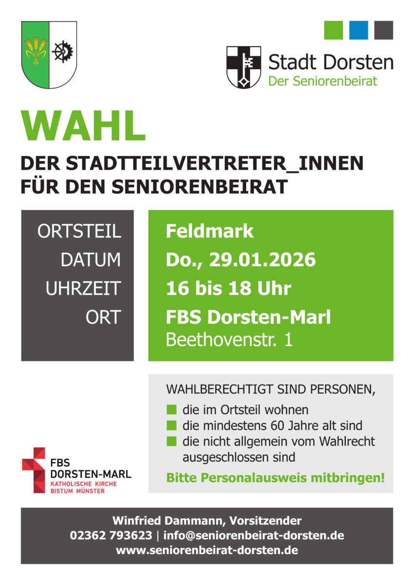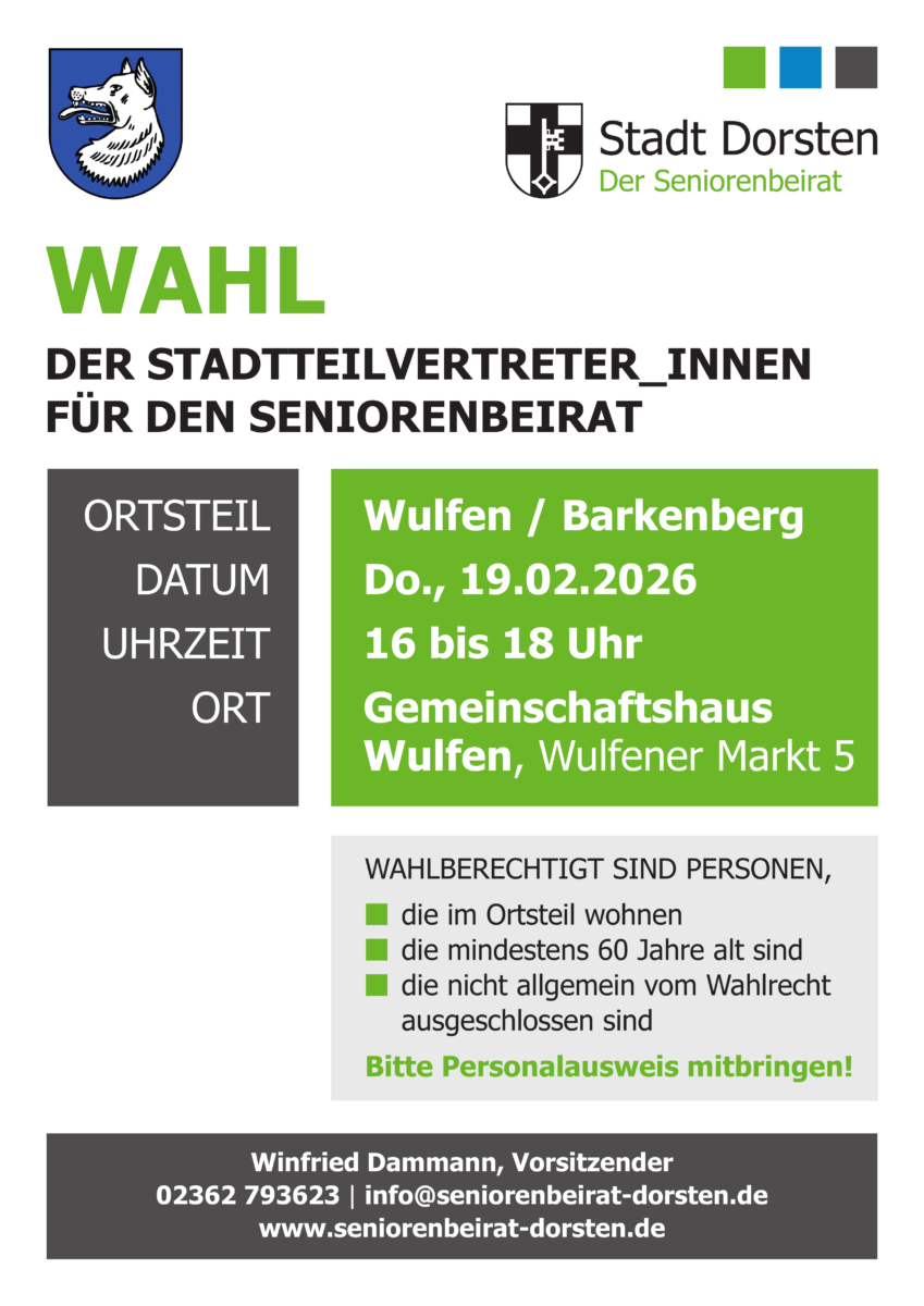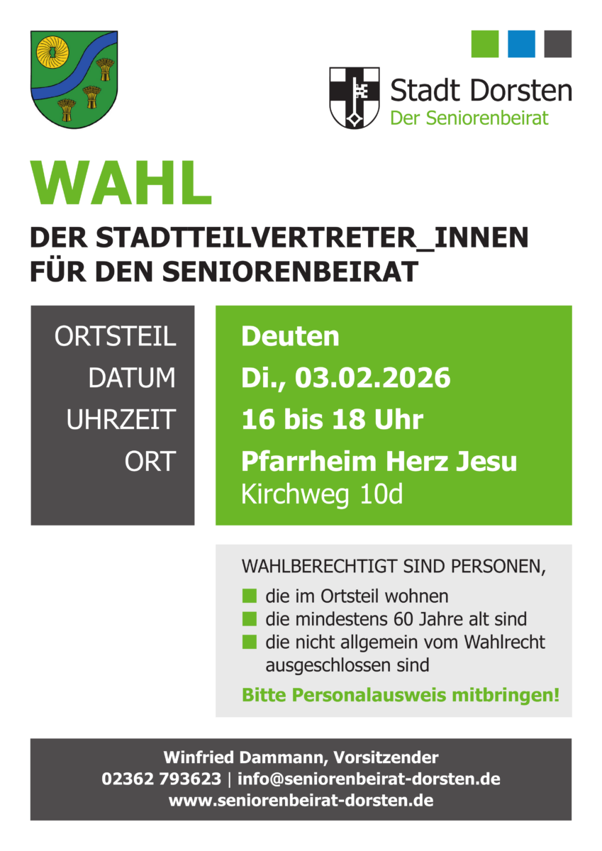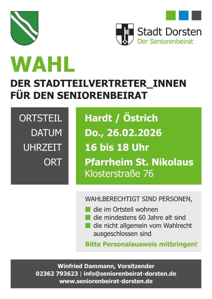 Im Zeitraum Ende Januar bis Ende Februar 2026 finden in allen Dorstener Stadtteilen die Wahlen der Stadtteilvertreter für den Seniorenbeirat statt.